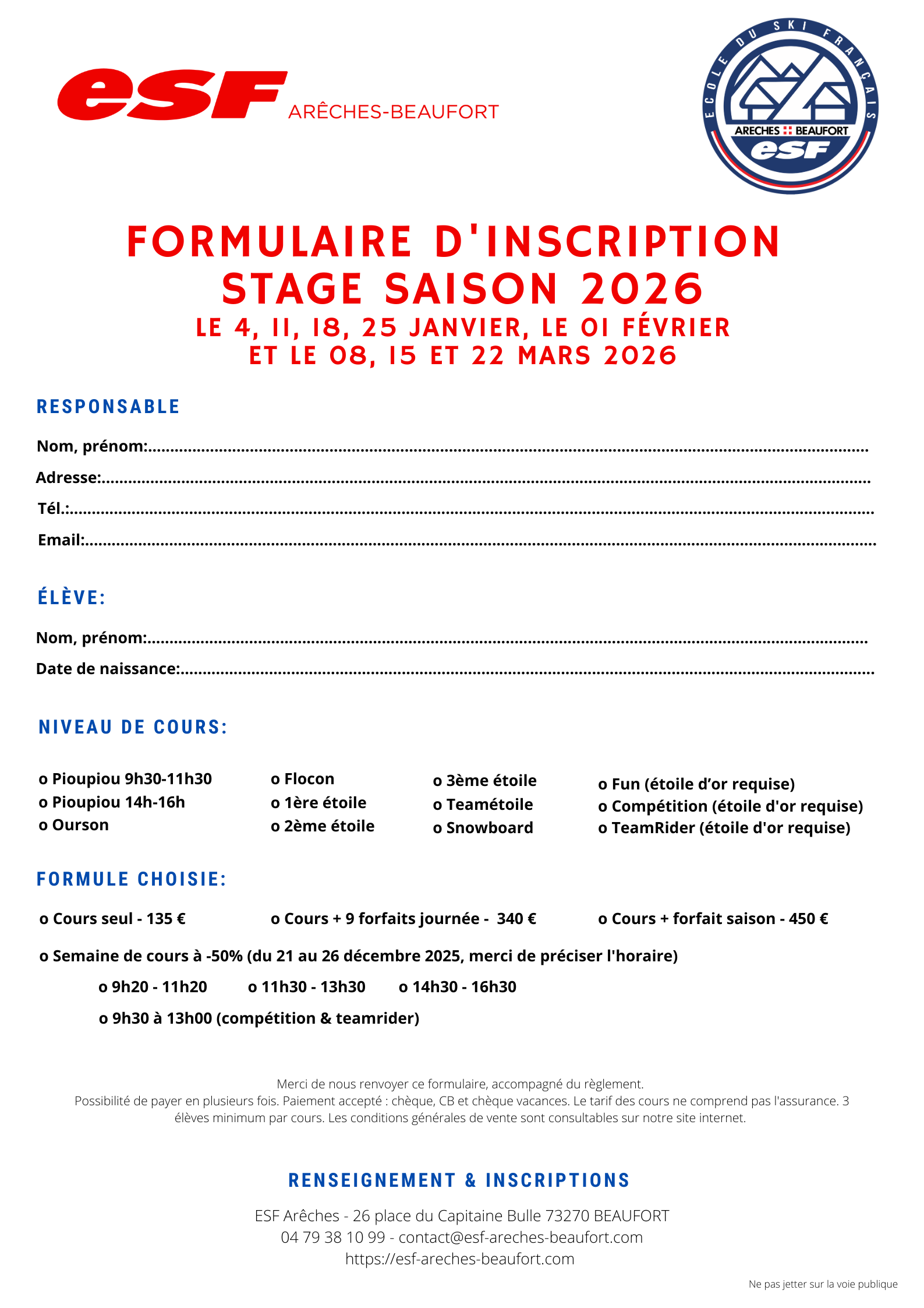 - Forfait saison: 315€